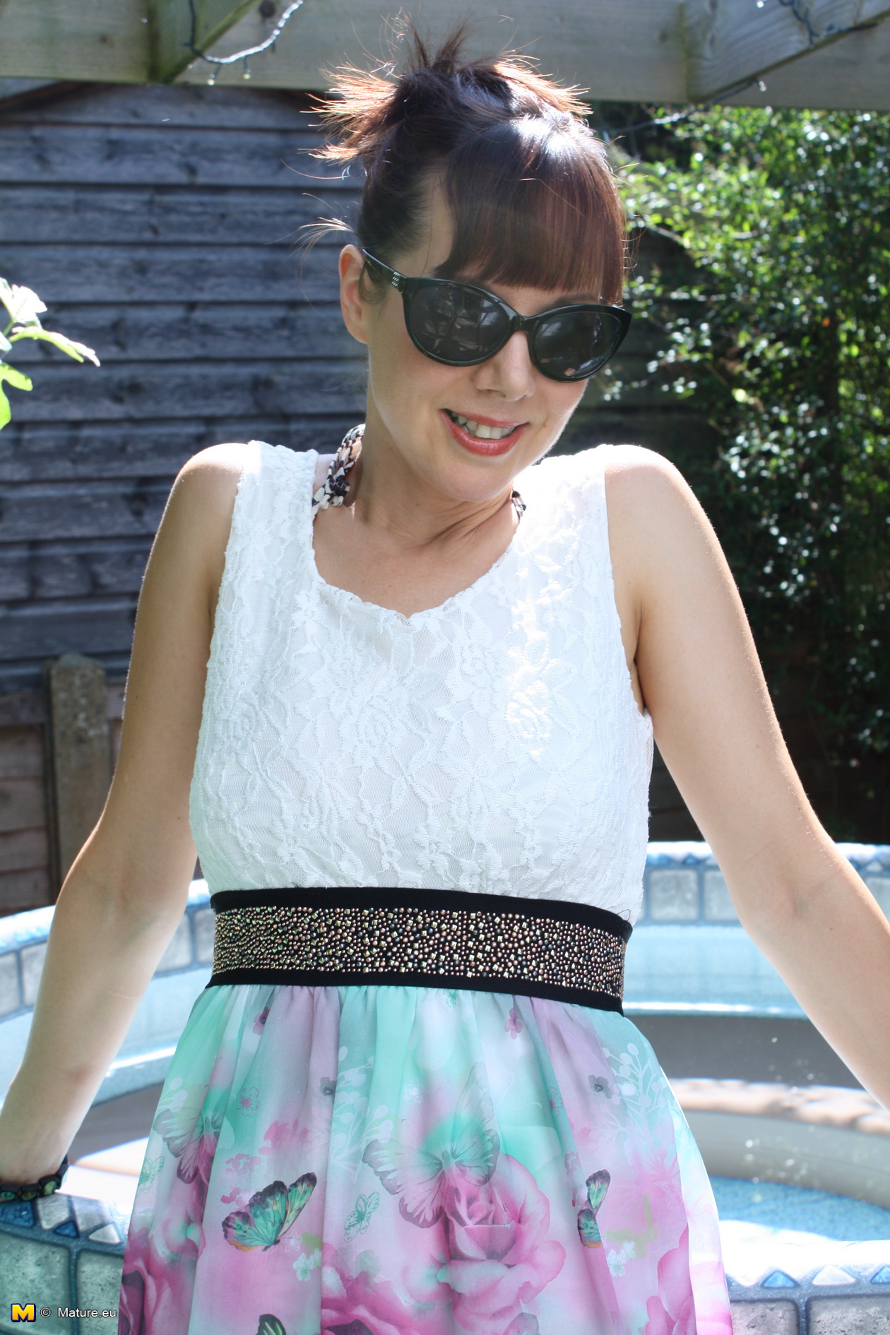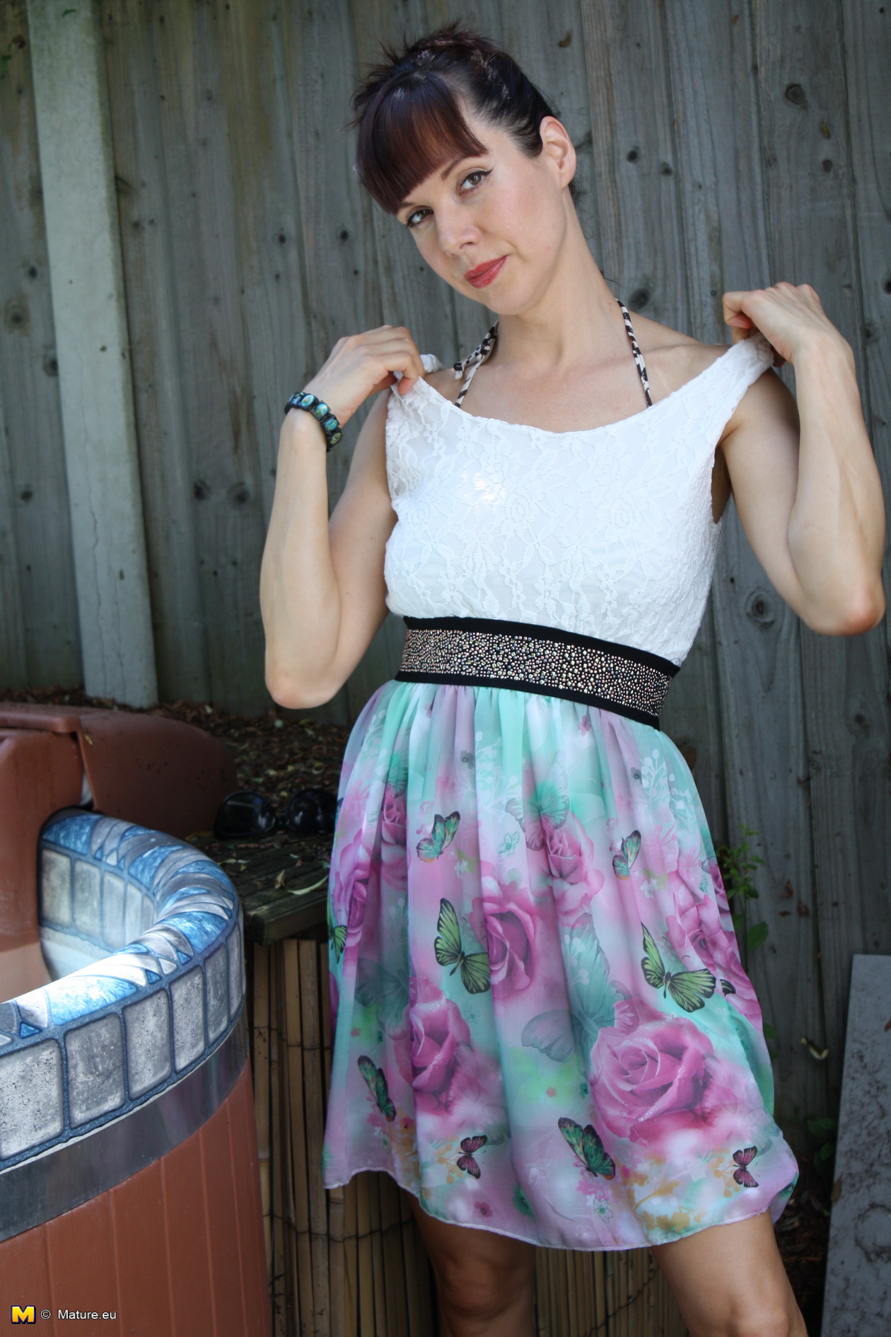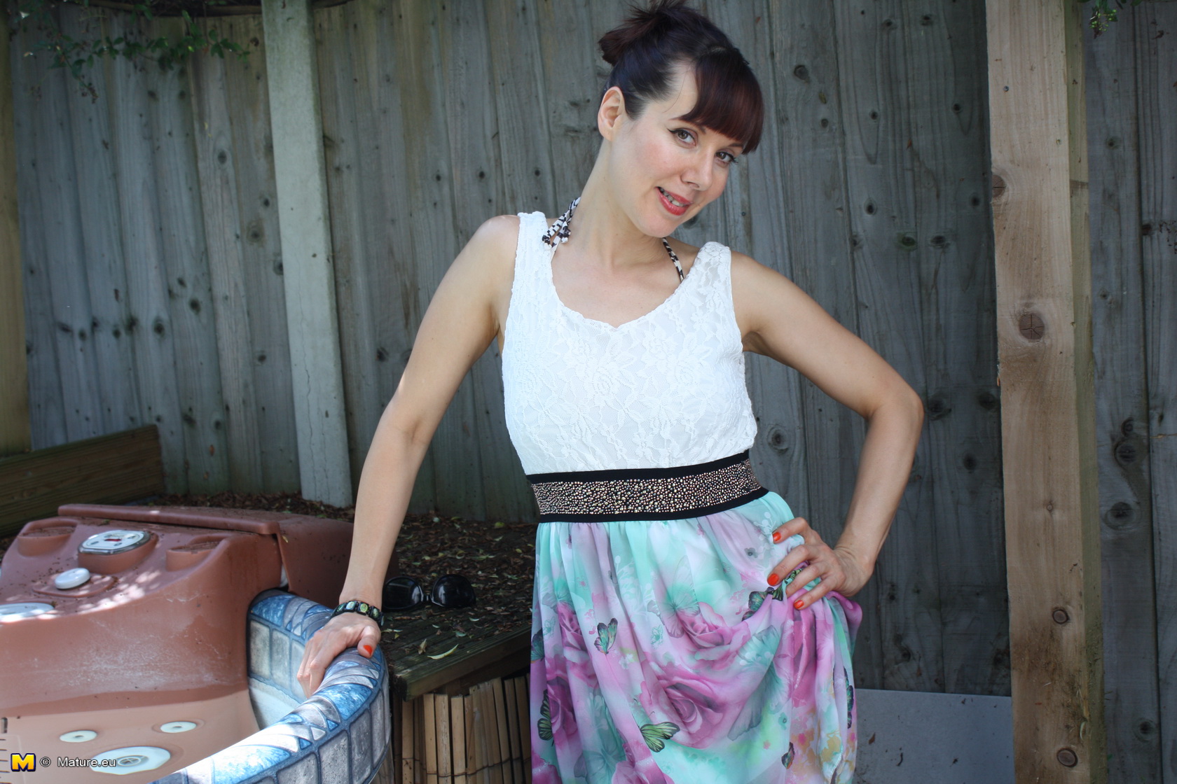 This young housewife has managed to convince her husband to build her a hot tub by sucking him off every night, so now she gets to play with herself in the sun while laying in some of the most relaxing hot water she’s ever imagined. Watch the hoe lose her bikini to reveal a pair of juicy round tits, then play with them (and her clit) in several different positions that make her cum quite quickly.